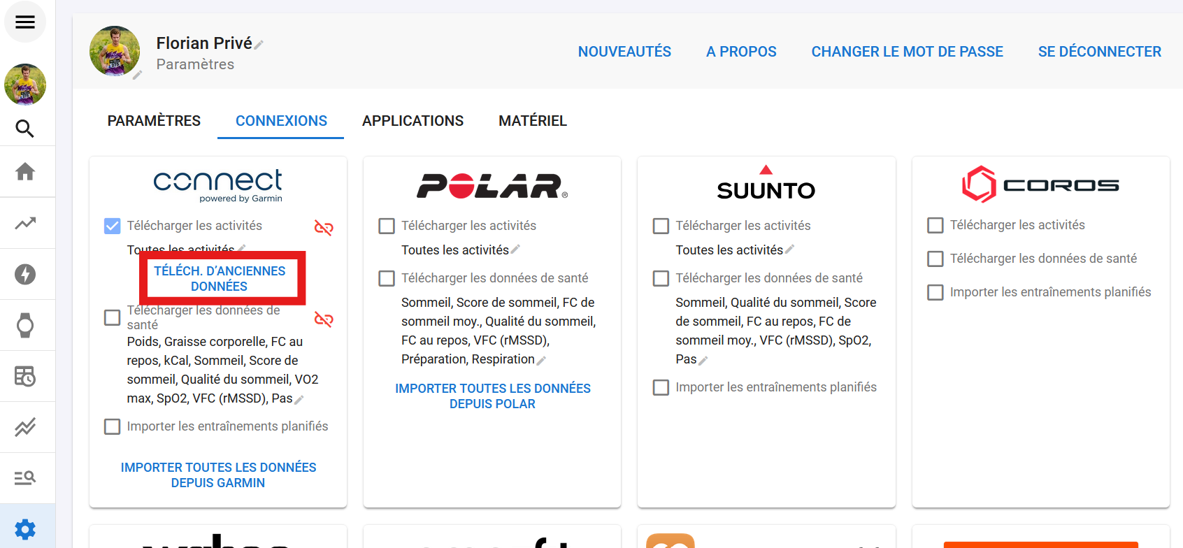 connectez les activités avec votre montre et/ou Strava (dans le menu Paramètres, onglet connexion), puis cliquez sur “Téléchargez d’anciennes données”. À noter que j’ai récemment déconnecté Strava car les laps communiqués à intervals ne correspondaient pas toujours aux laps réels.